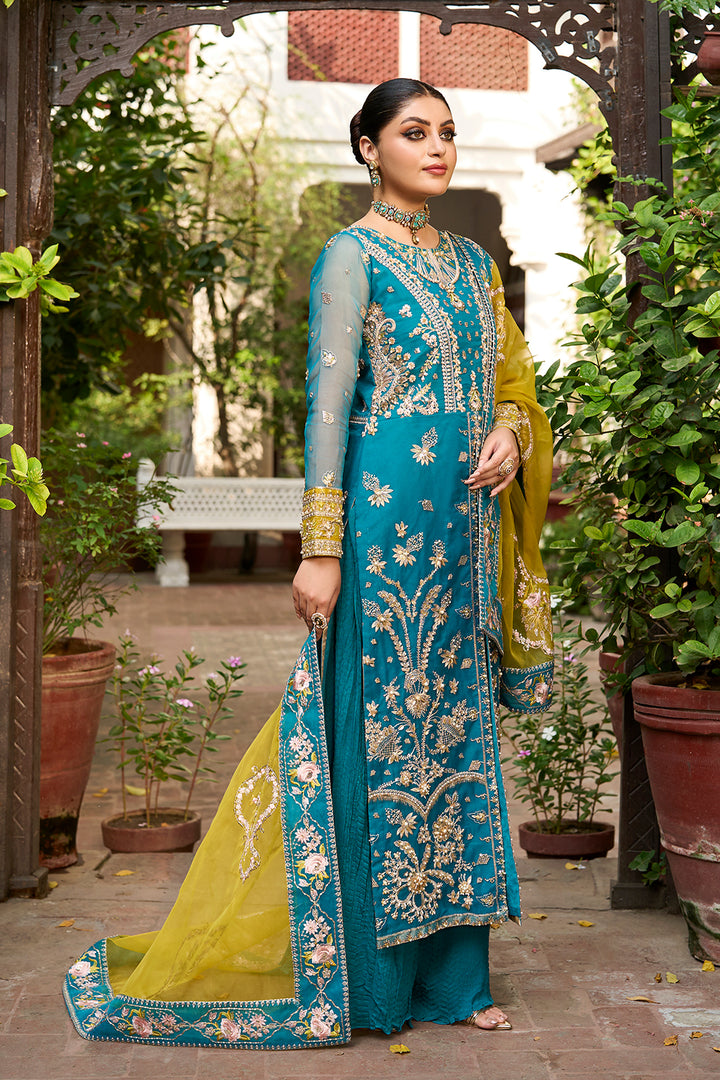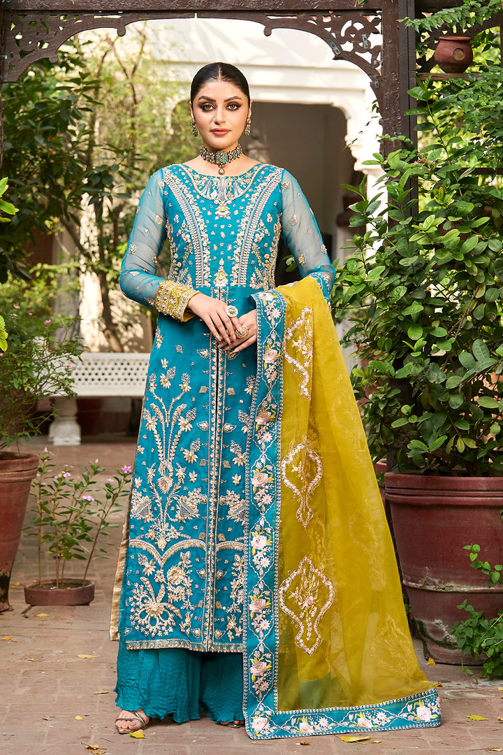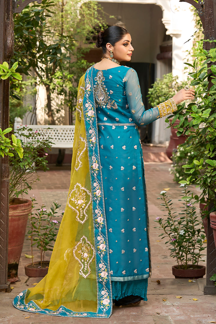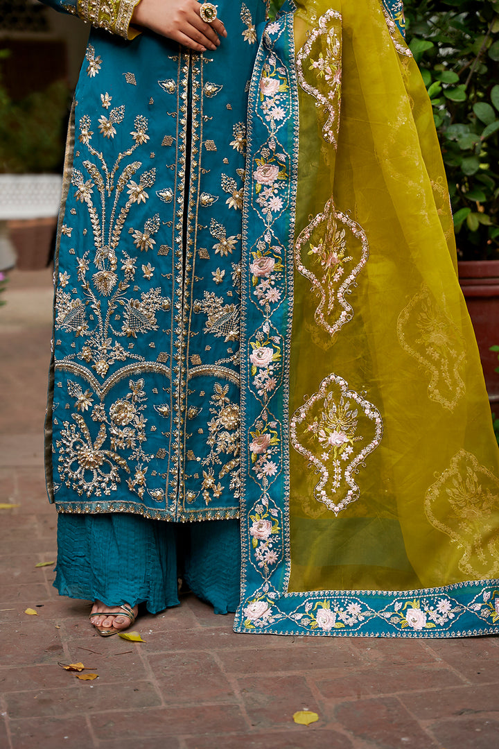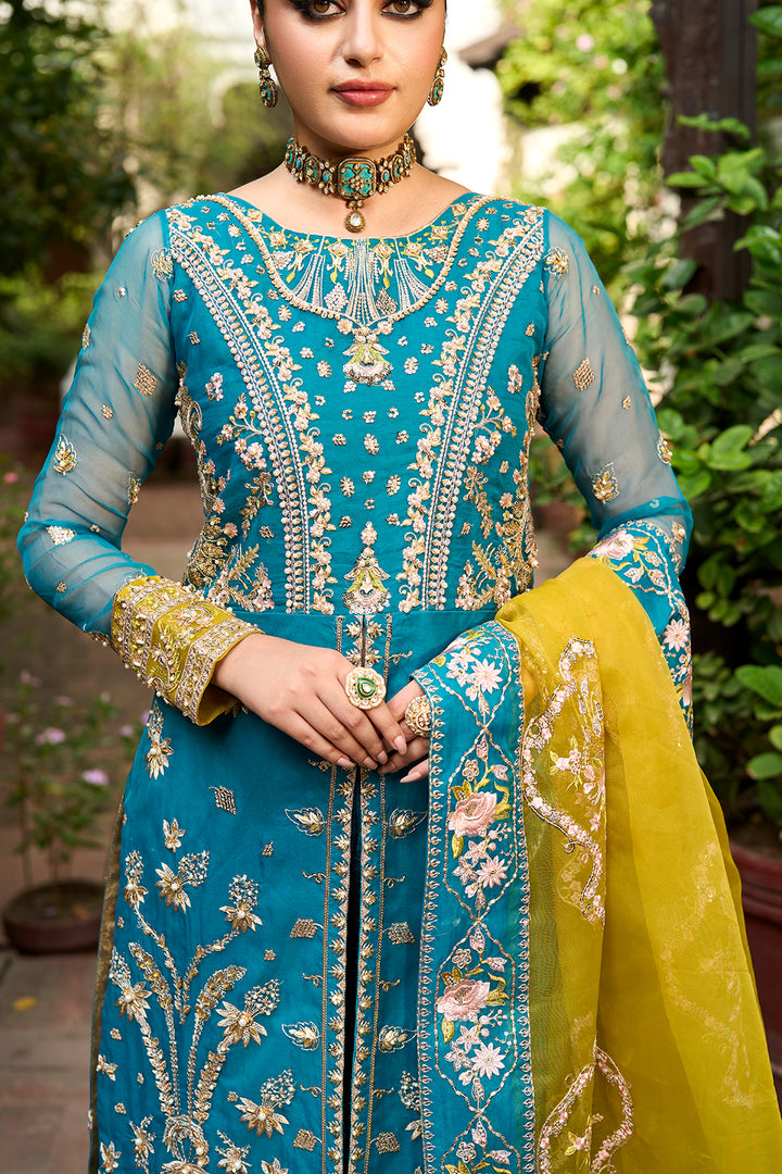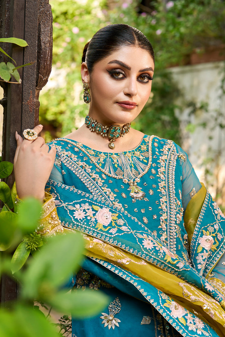 Rich jewels and crystal decorations highlight the intricately embroidered panels, bodice and sleeves of this timeless metal pishwas which radiates regal grace. This 3 PC wedding wear dress is ideal for special events because of the superb finishing and gorgeous embroidery which provide a sense of luxury. A stunning contrast parrot green organza dupatta and gold embroidered chiffon crush trousers complete the ensemble, giving it a striking, modern appearance. An ideal fusion of modern feelings and classic beauty.