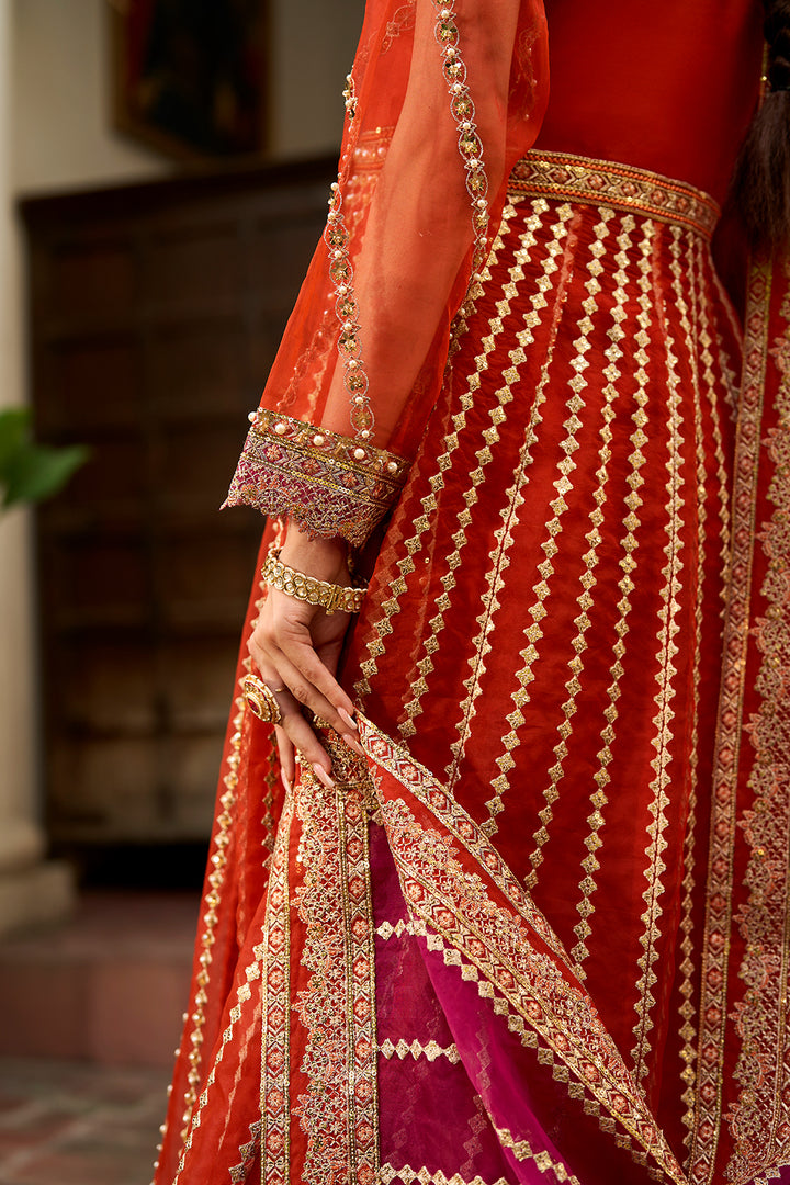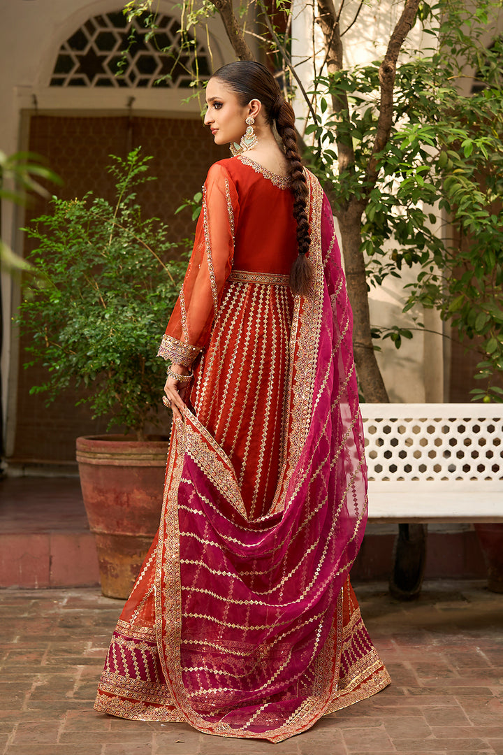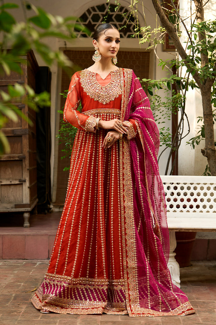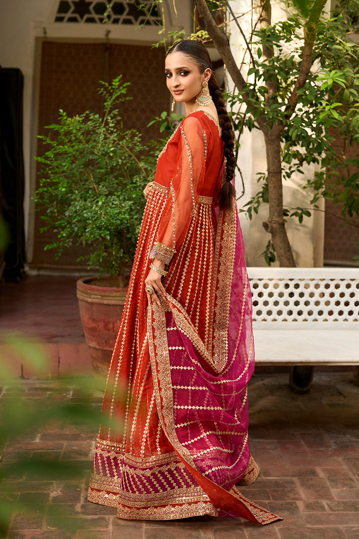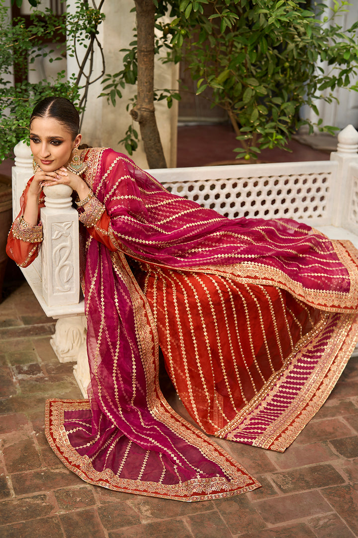 Made from luxurious organza fabric, this stunning formal gown features its trademark elaborate gold-toned decorations, tilla touches and a lot of sparkle from crystals, beads and sequins. The feminine form is perfectly highlighted by the sweetheart bodice resulting in a gorgeous figure. The outfit is perfect for a modern, timeless style that combines tradition and elegance since it is paired with a contrast organza dupatta that has an all-over spray and a front-worked border.