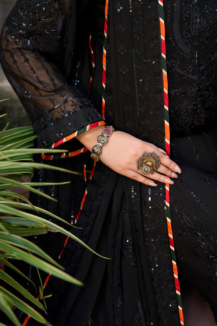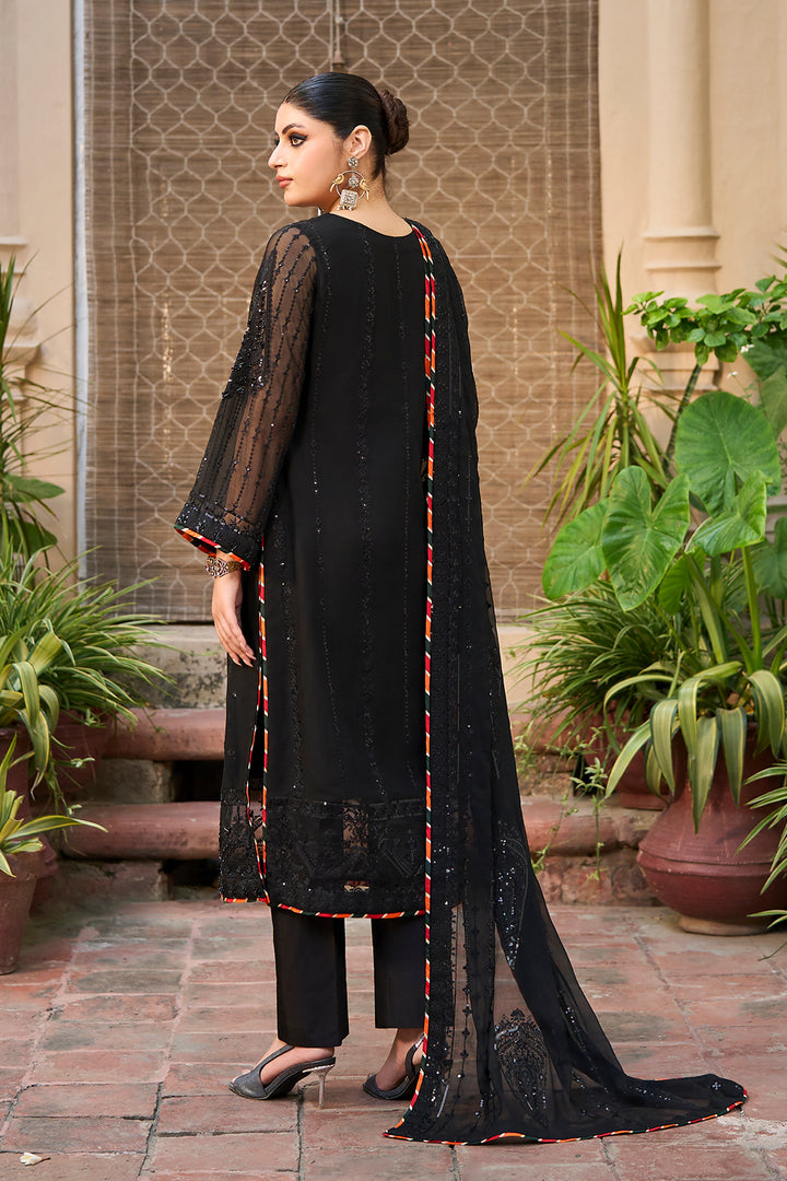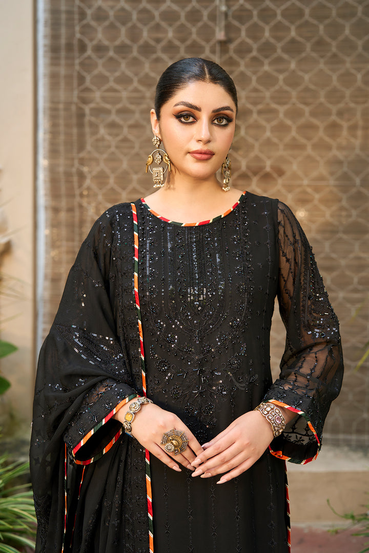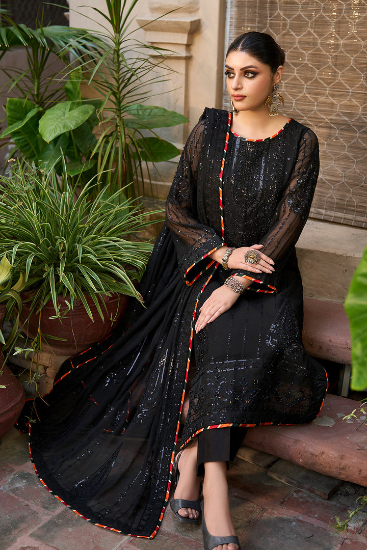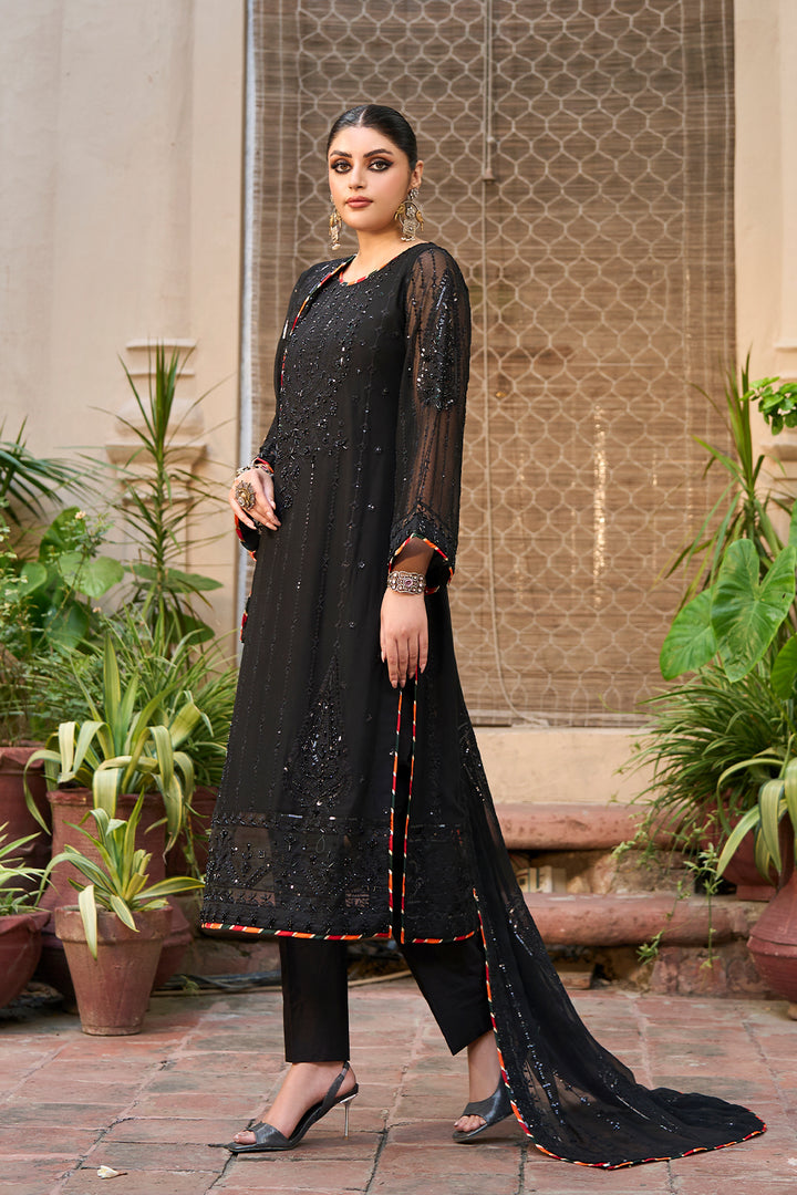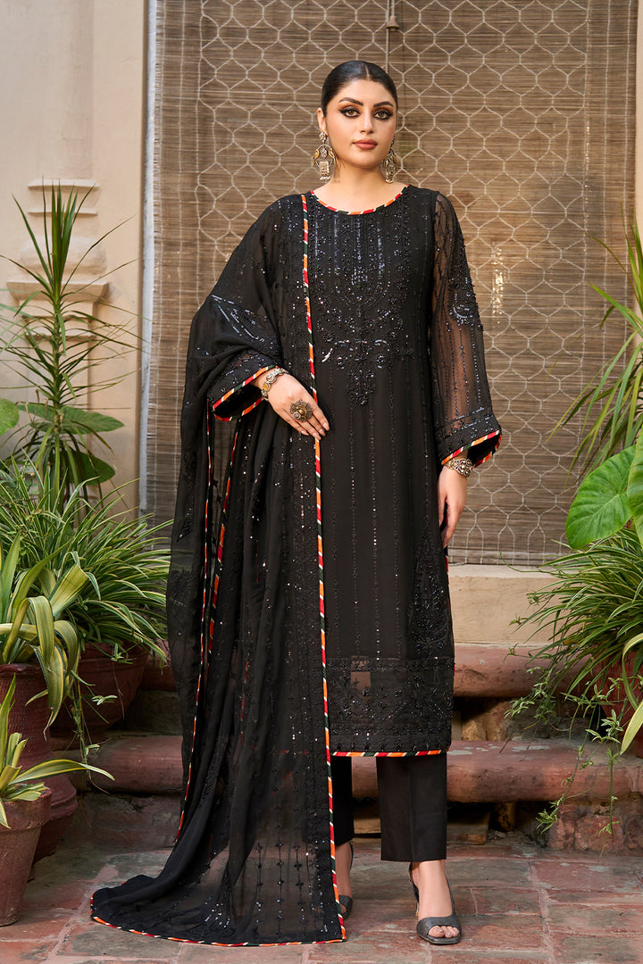 Wear this beautiful three-piece black chiffon dress to exude sophistication. A touch of elegance is added by the shirt's exquisite embroidery, which flows smoothly down the cloth. With its elaborate embroidery and decorations, the chiffon dupatta magnificently emphasises the design. The simple raw silk trouser completes this look in a modest yet stylish way. This ensemble is sure to create a memorable impression at any formal event, whether you pick for the stitched or unstitched version.