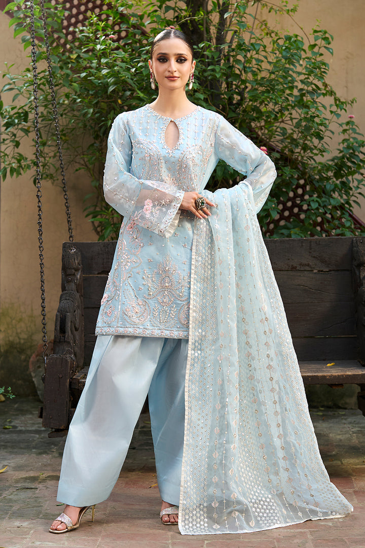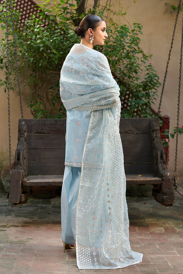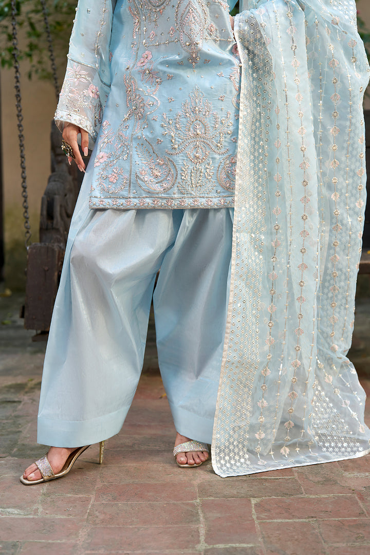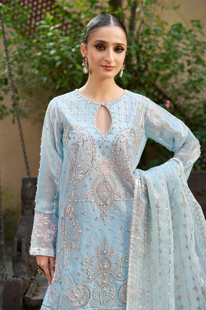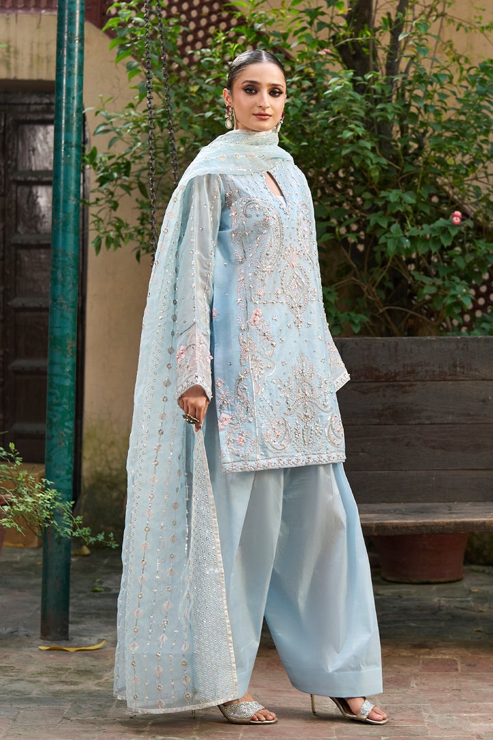 This sky blue silk dress has a heavily embroidered neckline with tilla, Dhaga and sequins, which oozes classic sophistication. A touch of elegance is added by the exquisitely designed flower motif on the front and the entire ensemble is completed with delicate embroidery on the dupatta, hemline, and sleeves. Because of its delicate texture and grace. The organza dupatta elevates this woman's dress. For females who want a distinctive but glittering style for any special occasion, this ensemble is ideal when paired with an opulent silk Farshi shalwar.