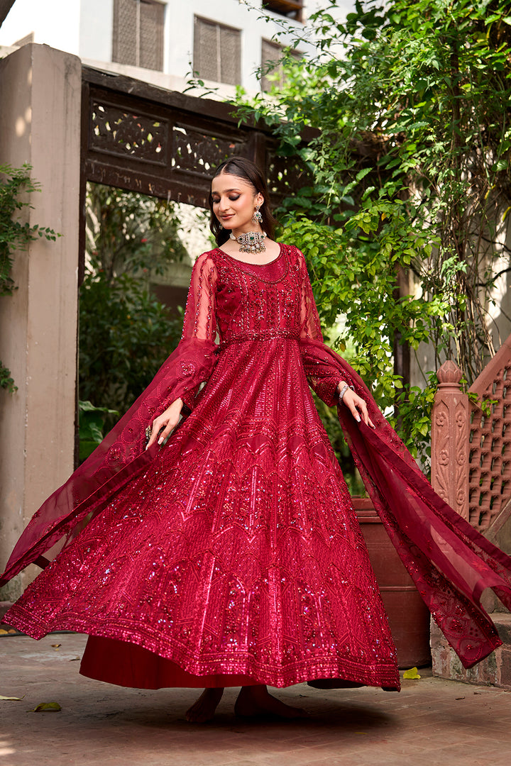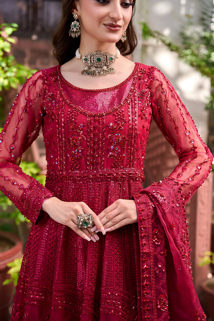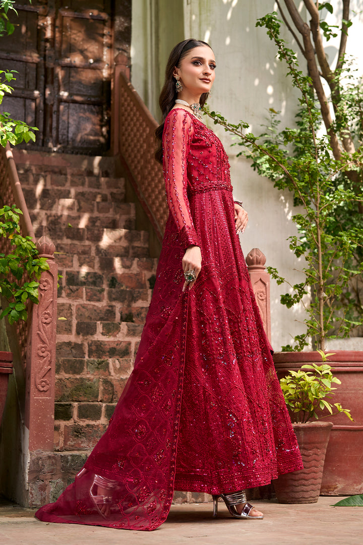 Float through your festivities in style with this gorgeous maroon Organza dress. Designed for people who value traditional beauty this dress's timeless shape accentuates your inherent elegance. Completely covered in beadwork and obsidian thread the bodice creates a gorgeous lattice design that catches the light brilliantly when combined with the carefully positioned sequins.