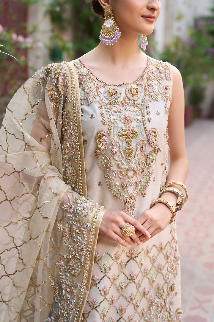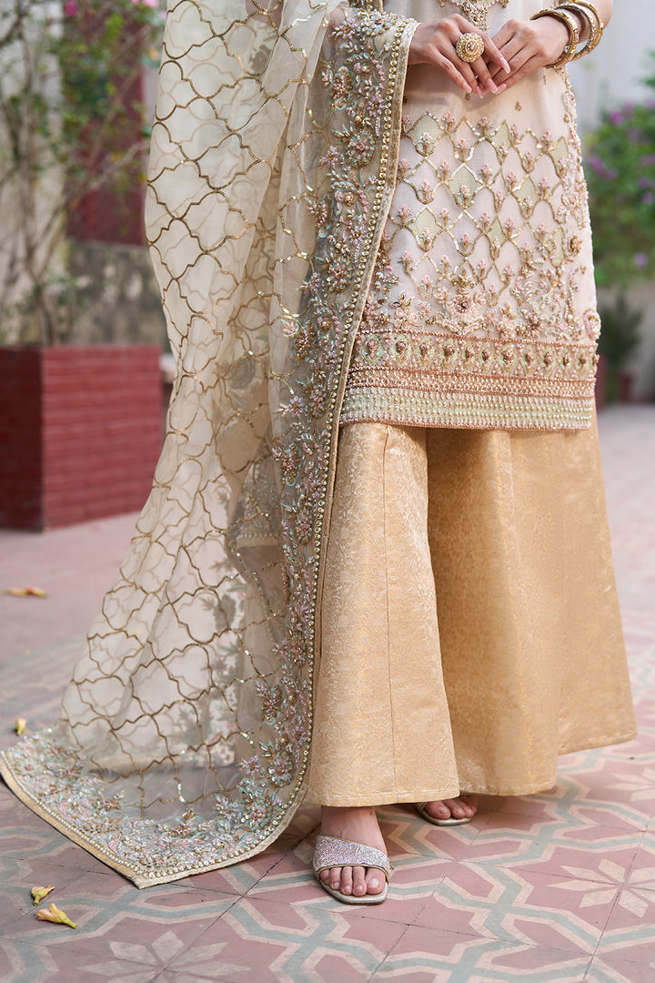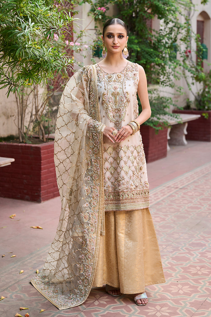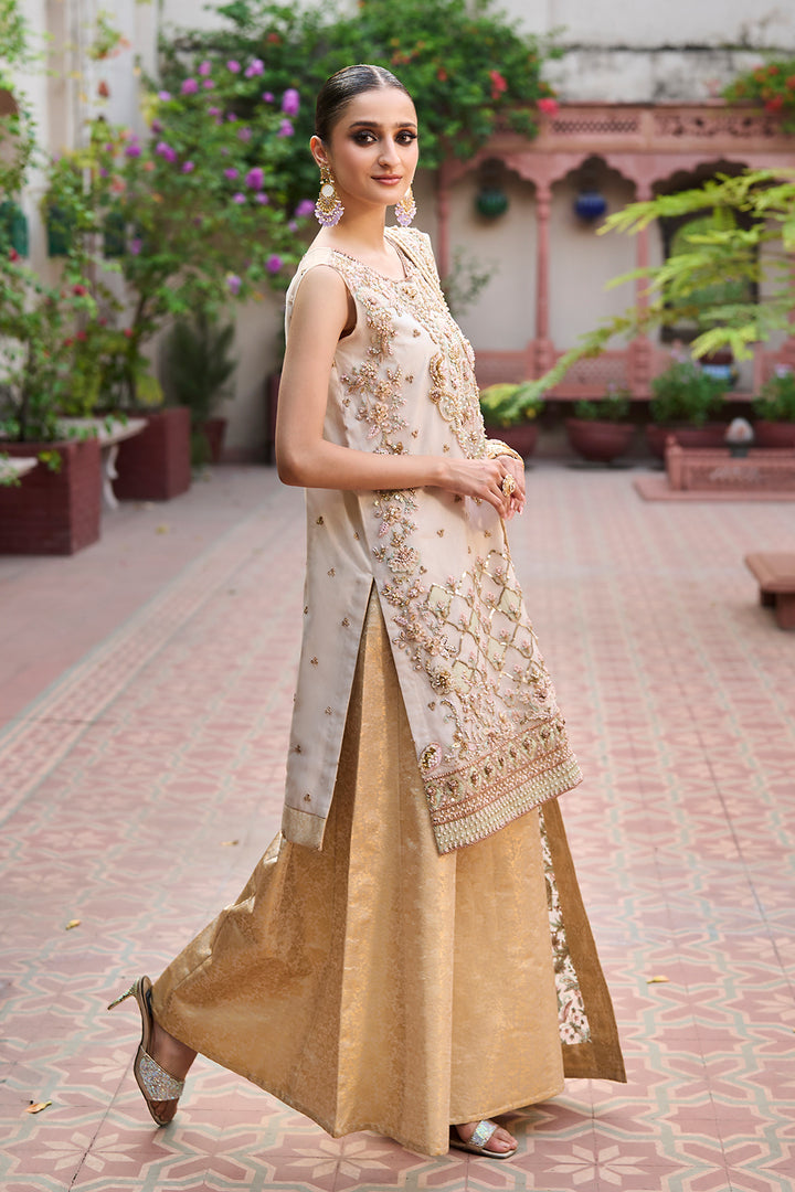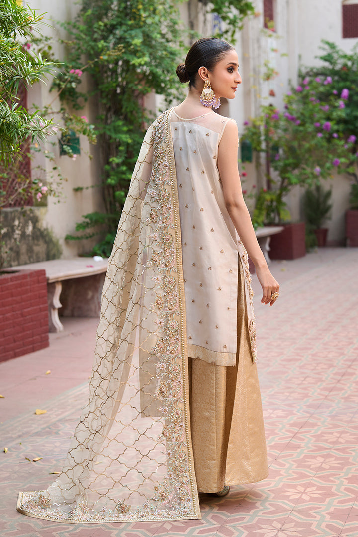 This beautiful item combines the most beautiful off-white and gold. A shirt with tiny 'nazuk' pearls and elaborate gold tilla and thread work elevates a traditional Jamawar Plazo. An elegantly embroidered organza dupatta with delicate borders is part of the set. This design is the ideal fusion of timeless beauty and modern refinement enhanced with a jewel encrusted neckline.