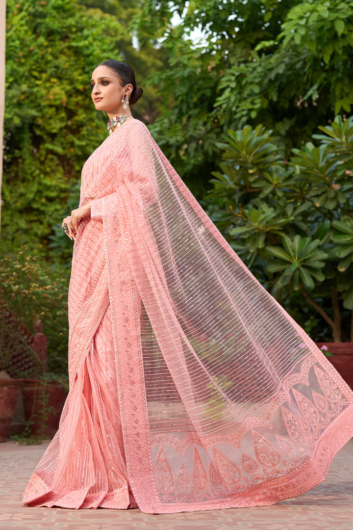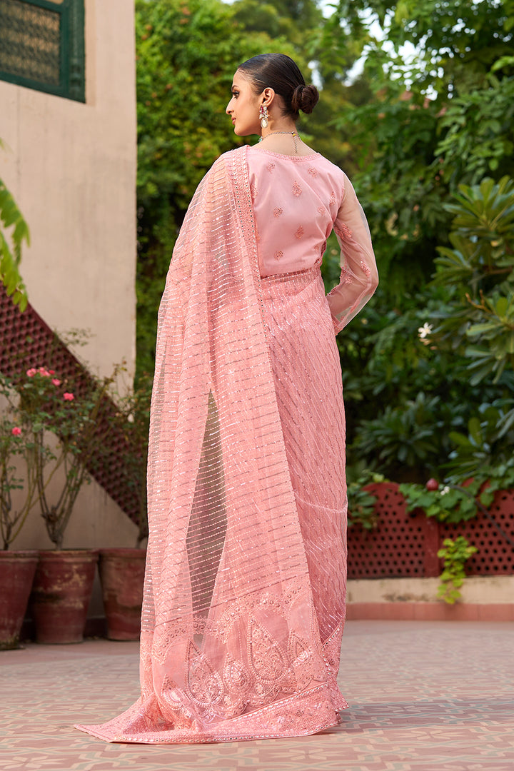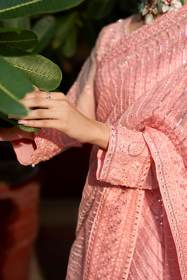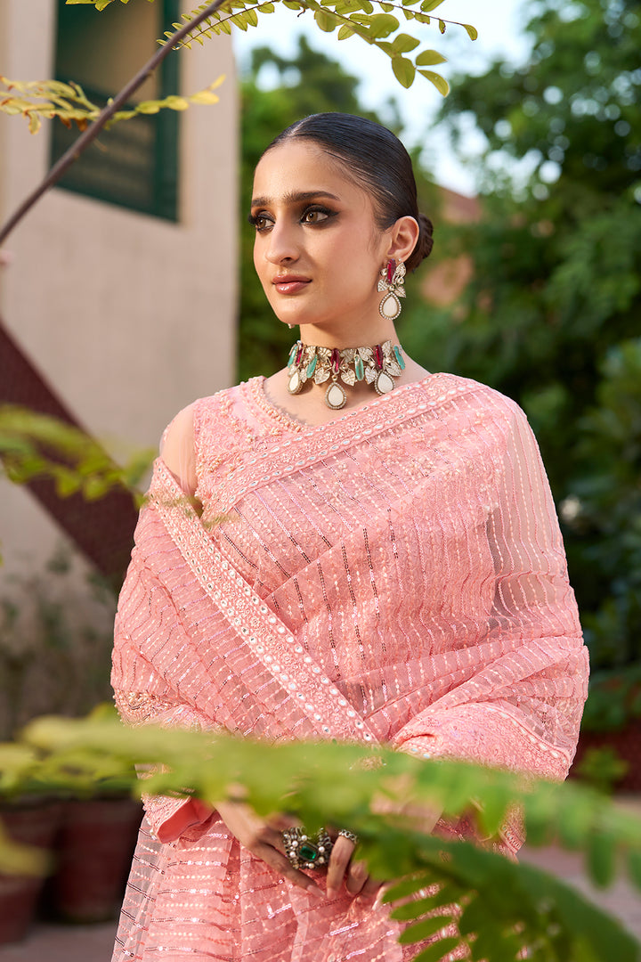 Wear a modern and elegant Farrukh Zia pastel pink saree to look charming for any event. The delicate pearl embroidery on the neckline, saree pallu, chatta, borders and sleeves of this delicate pink saree is beautiful. A jaal of glittering sequins adorns the whole saree, giving the classic shape a glamorous touch. Raw silk trousers complete the saree which is a classic and wonderful style that is ideal for your loved one's special occasions. For a timeless style that exudes refinement and charm choose this elegant item.